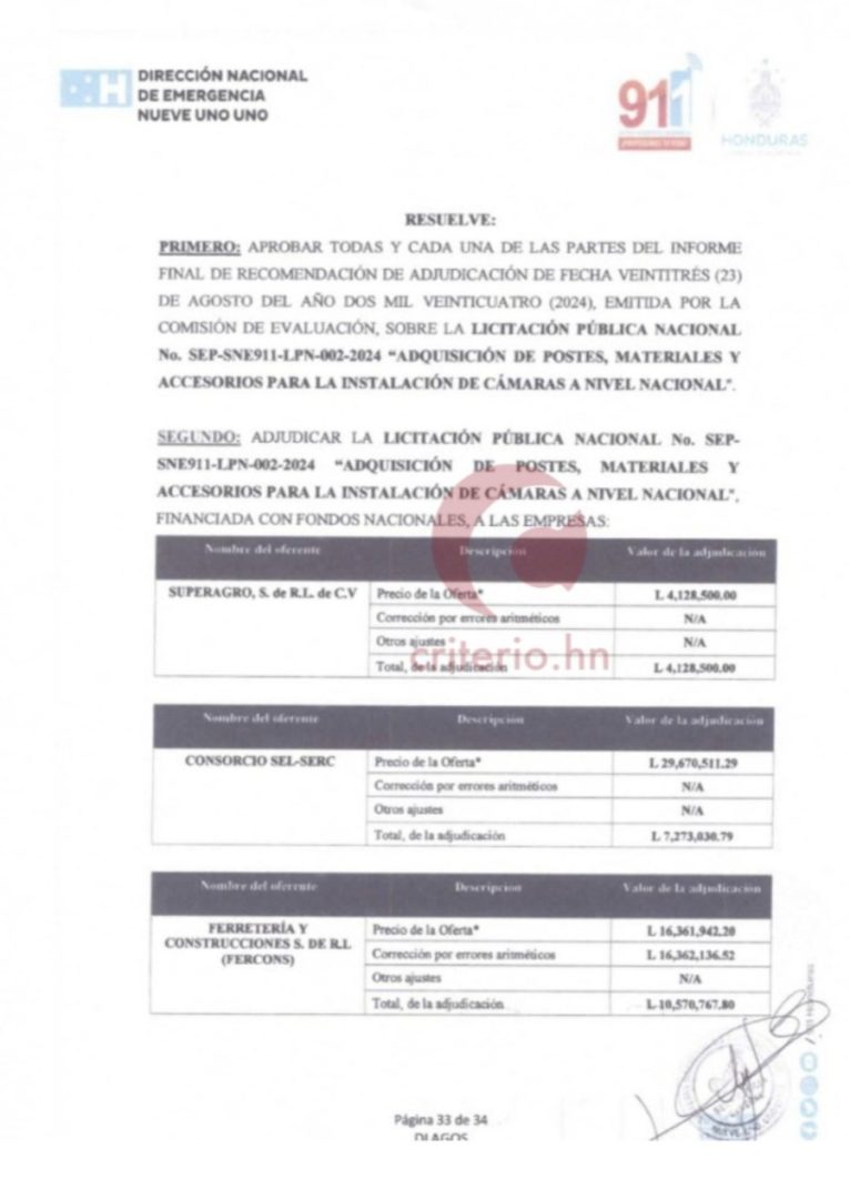 Según el documento Resolución N° SNE-911-SG-004-2024 la licitación se le adjudicó a Superagro S. de R.L. de C.V. por un monto de 4,128,500.00 lempiras; mientras que el Consorcio Ser-Serc obtuvo un contrato por un monto de 7,273, 030.79 lempiras y Ferreterías y Construcciones S. de R.L. (Fercons) logró un contrato de 10,570,767.80 lempiras.