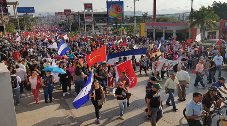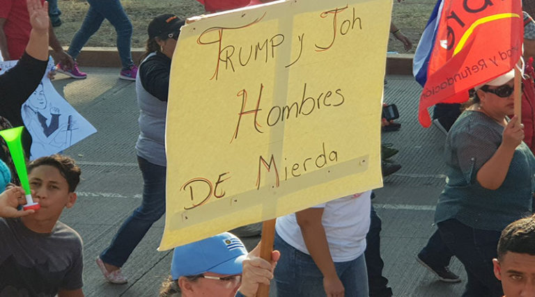 Por: Dick & Miriam Emanuelsson, Resumen Latinoamericano TEGUCIGALPA / ¡”Trump y JOH, hombres de mierda”! dice la pancarta que lleva el manifestante y hondureño José Espinoza. Él y los centroamericanos