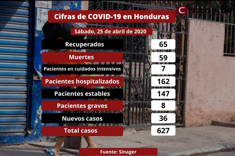 Honduras: 59 muertos y 627 casos positivos de COVID-19