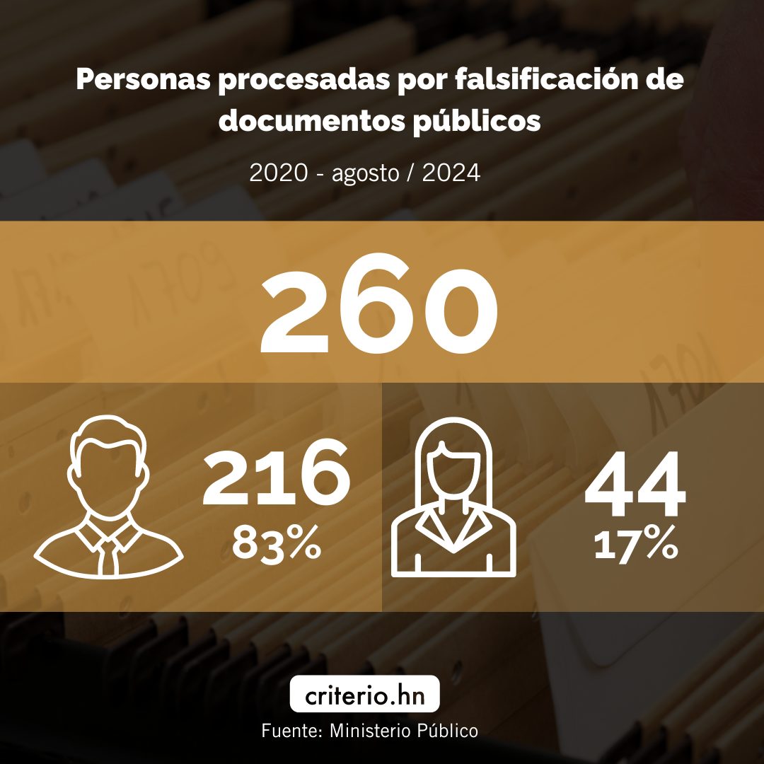 Según datos obtenidos por Criterio.hn, la mayoría de las personas procesadas por el delito de falsificación de documentos públicos son hombres, siendo el departamento de Cortés donde se ha registrado el mayor número de casos