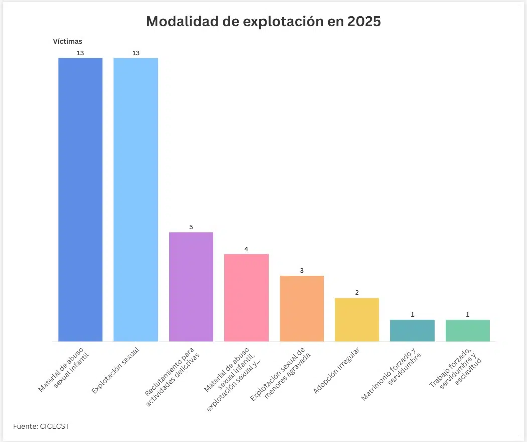 Las modalidades en las que mayormente fueron instrumentalizadas las víctimas son explotación sexual y abuso sexual infantil con 13 casos cada uno, mientras que las de menores cifras son matrimonio forzado y servidumbre y trabajo forzado, servidumbre y esclavitud con uno respectivamente.