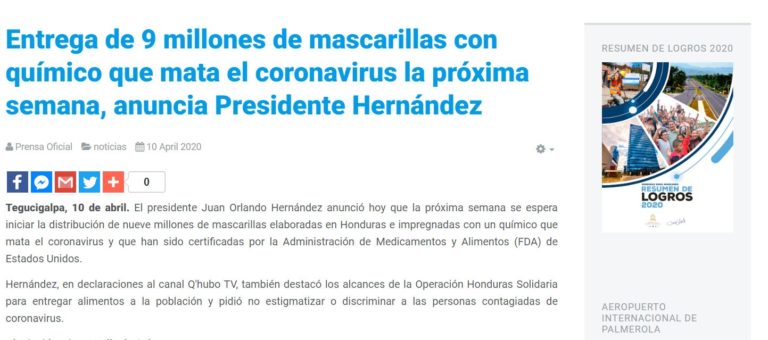 El pasado 10 de abril, el mandatario Juan Hernández anunció que para una semana después estarían listas 9 millones de mascarillas elaboradas en Honduras y que estarían impregnadas con un químico que mata el coronavirus, un mes después los hondureños siguen esperando esas mascarillas especiales.