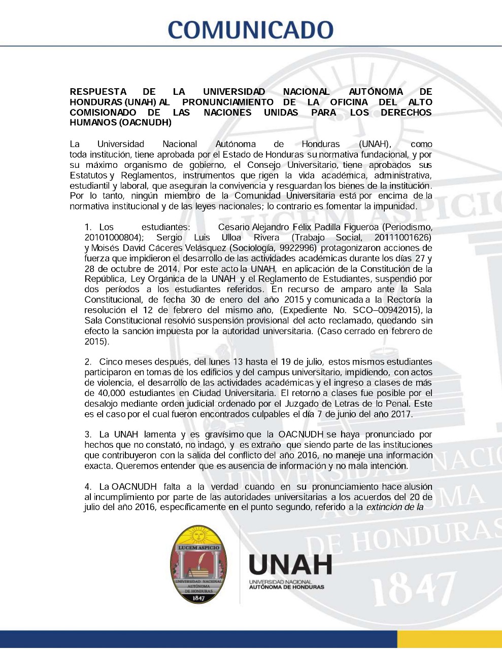 La UNAH lamenta y es gravísimo que la OACNUDH se haya pronunciado por hechos que no constató, no indagó, y es extraño que siendo parte de las instituciones que contribuyeron con la salida del conflicto del año 2016, no maneje una información exacta. Queremos entender que es ausencia de información y no mala intención, añade el texto.
