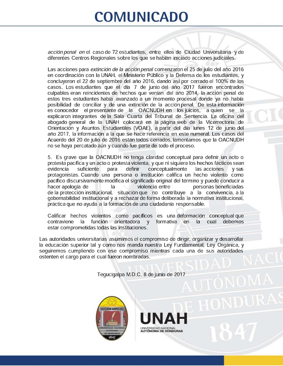 “La OACNUDH falta a la verdad cuando en su pronunciamiento hace alusión al incumplimiento por parte de las autoridades universitarias a los acuerdos del 20 de julio del año 2016, específicamente en el punto segundo, referido a la extinción de la acción penal en el caso de 72 estudiantes, entre ellos de Ciudad Universitaria y de diferentes Centros Regionales sobre los que se habían iniciado acciones judiciales”, dice un comunicado que la Alma Mater difundió en respuesta a la agencia de las Naciones Unidas.