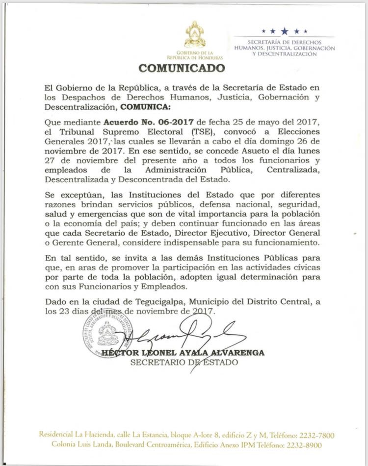 Tegucigalpa.- El gobierno presidido por el candidato del Partido Nacional, Juan Hernández, mediante un comunicado de prensa ha anunciado que el aproximo lunes 27 de noviembre será feriado para los empleados públicos.