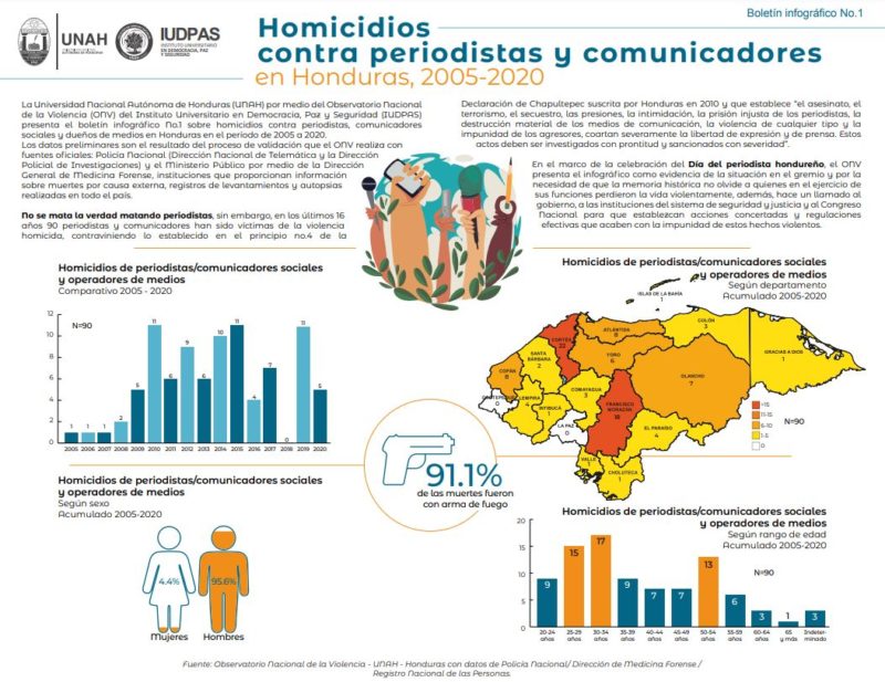 En el marco de la celebración del día del periodista en Honduras que se celebró el pasado 25 de mayo, el Observatorio Nacional de la Violencia (ONV) del Instituto Universitario en Democracia, Paz y Seguridad (IUDPAS) por medio de la Universidad Nacional Autónoma de Honduras (UNAH) presentó un boletín infográfico No.1 sobre homicidios contra periodistas, comunicadores sociales y dueños de medios en Honduras en el periodo 2005 a 2020.