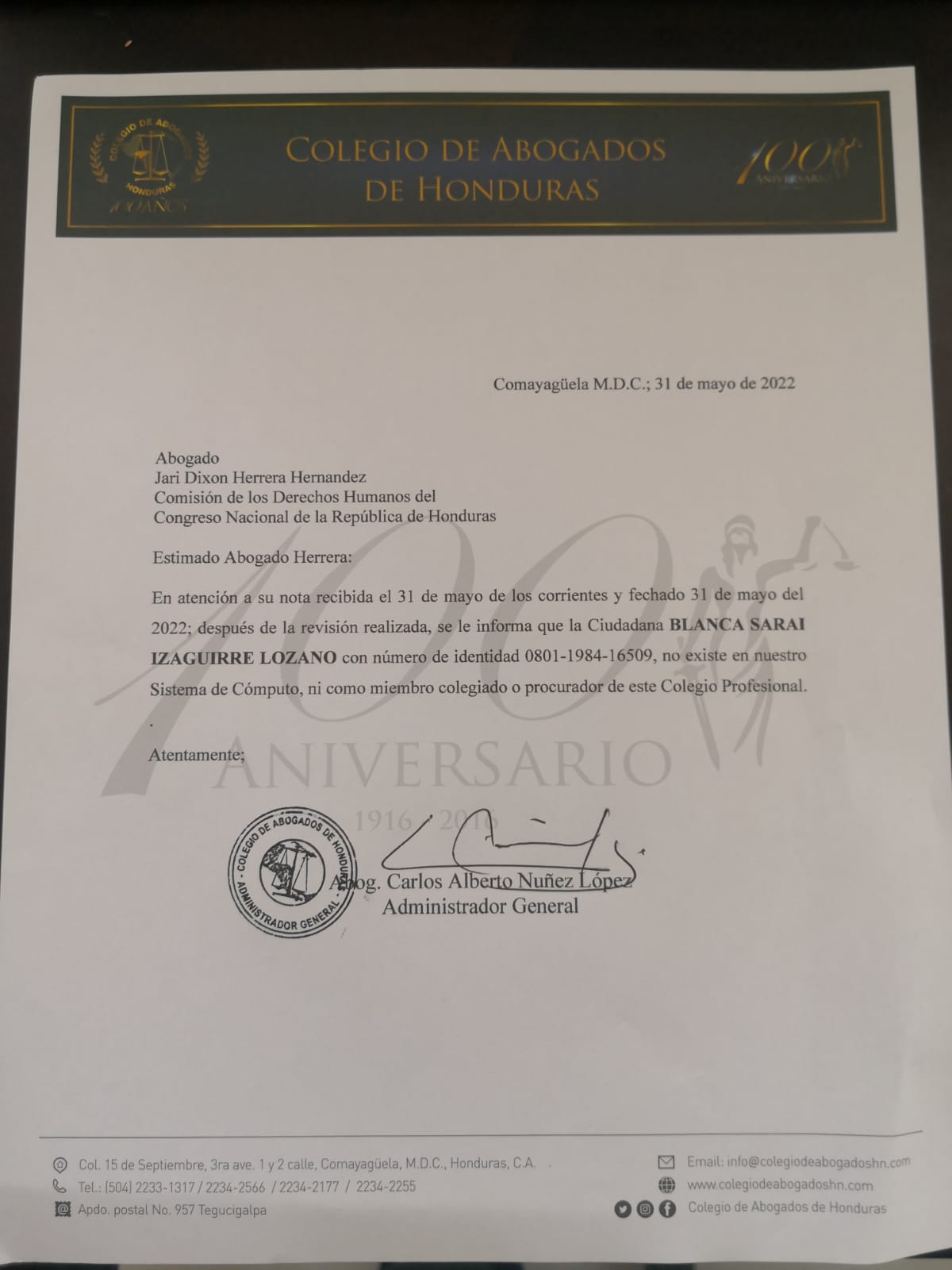 Aunque la titular del Conadeh publicó en las últimas horas una fotografía de su título universitario, la Comisión de Justicia y Derechos Humanos presentó ante el pleno del Legislativo una carta del Colegio de Abogados de Honduras (CAH) que indica la no existencia de algún registro suyo como integrante colegiada o como procuradora de ese colegio.
