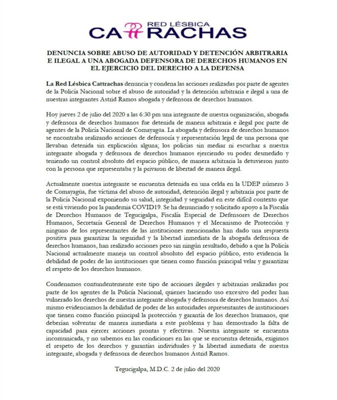De acuerdo a la denuncia emitida por Cattrachas, la abogada se encuentra detenida en una celda en la UDEP número 3 de Comayagua y fue víctima del abuso de autoridad, detención ilegal y arbitraria por parte de la Policía Nacional exponiendo su salud, integridad y seguridad en este difícil contexto que se está viviendo por la pandemia Covid-19.