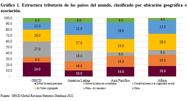 Conforme los datos de la OECD (2022), el financiamiento de los aparatos estatales de los países calificados a ese organismo, depende, de mayor forma, de las contribuciones que realiza la población en materia de impuesto sobre la renta y cotizaciones a la seguridad social, mientras que, en otras latitudes, depende en gran medida de la tributación aplicada a los bienes y servicios. Como tal, mientras para los países desarrollados de la mayor parte de Europa y Norteamérica, agrupados en la OCDE, el peso relativo de la tributación directa es de alrededor del 60.0% del total, implicando una estructura tributaria progresiva; para América Latina dicho porcentaje es 44.0%, en los países de Asia y Pacífico 41.0% y en África 45.0%, connotando estructuras tributarias regresivas ‒merece análisis separado el funcionamiento del sistema previsional en los países de Asia Pacífico, que en su mayor parte no implica contribuciones al Estado‒.