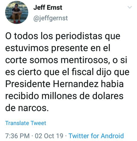 Así respondió el periodista Jeff Ernst quien fue el primero en dar la noticia que JOH había recibido un millón de dólares de parte de el Chapo Guzmán