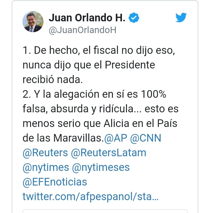 Tegucigalpa.- El titular del régimen de Honduras, Juan Hernández, quien fue mencionado este miércoles de recibir un millón de dólares para su campaña, de parte del Chapo Guzmán, dijo que eso es falso y que el fiscal nunca dijo eso.