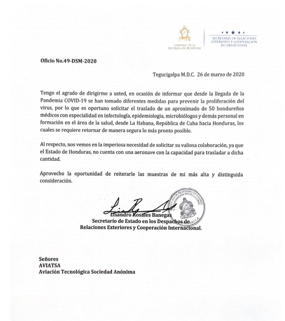 Mediante el oficio el canciller Lisandro Rosales, le hace saber a la empresa Aviatsa que, en el marco de la pandemia por el Covid-19 y con base a la adopción de diferentes medidas para prevenir la proliferación del virus, se le solicita “el traslado de un aproximado de 50 hondureños médicos con especialidad en infectología, epidemiología, microbiología y demás personal en formación en el área de la salud, desde La Habana, República de Cuba hacia Honduras, los cuales se requiere retornar de manera segura lo más pronto posible”.