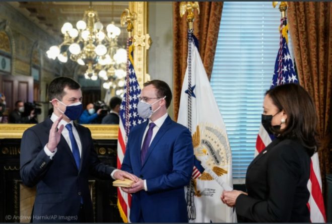 En la foto de portada: Pete Buttigieg (izda.), junto a su esposo, Chasten Buttigieg, al ser juramentado como secretario de Transporte el pasado 3 de febrero. (© Andrew Harnik/AP Images)