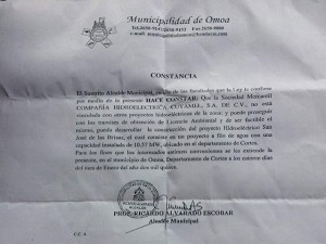 En el citado documento, el alcalde de Omoa, Ricardo Alvarado Escobar, en uso de sus facultades, hace constar que la Sociedad Mercantil COMPAÑIA HIDROELÉCTRICA CUYAMEL puede desarrollar la construcción del proyecto Hidroeléctrico San José de Las Brisas, este documento fue firmado el año pasado por el alcalde.