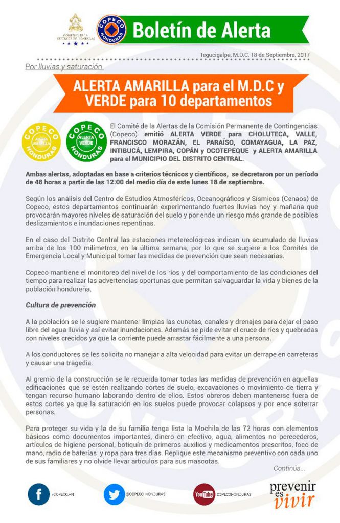 Tegucigalpa.- El Comité Permanente de Contingencias (Copeco) emitió este lunes alerta verde y amarilla para diez departamentos por las fuertes lluvias que azotan Honduras.