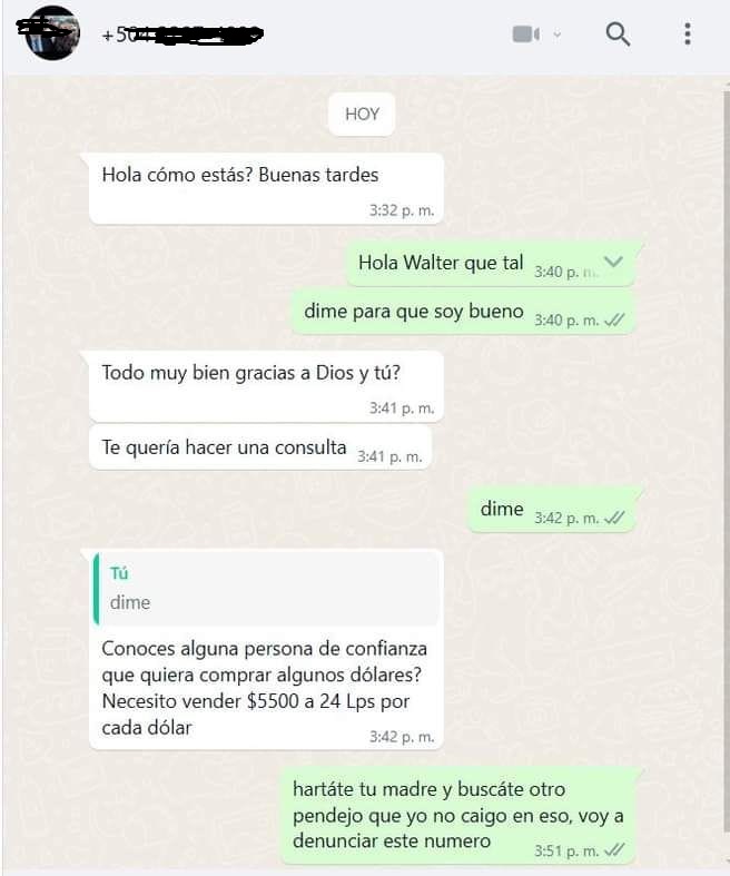 Según relató una persona a Criterio.hn, recibió un mensaje de un contacto con quien intercambió saludos. Sin embargo, lo extraño fue que le ofrecieron vender dólares a 24 lempiras, aprovechando que el cambio del dólar estaba a 25 lempiras.