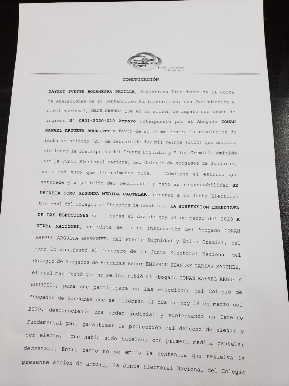 Al cierre de esta nota circuló la resolución de la Corte de Apelaciones de lo Contencioso Administrativo resolvió la suspensión inmediata de las elecciones del Colegio de Abogados de Honduras elecciones que se llevaron a cabo este día a nivel nacional.