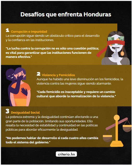 Su experiencia en estos roles le ha permitido abordar la compleja realidad hondureña, donde la pobreza extrema, la corrupción y la migración son problemas interrelacionados que afectan a la población.