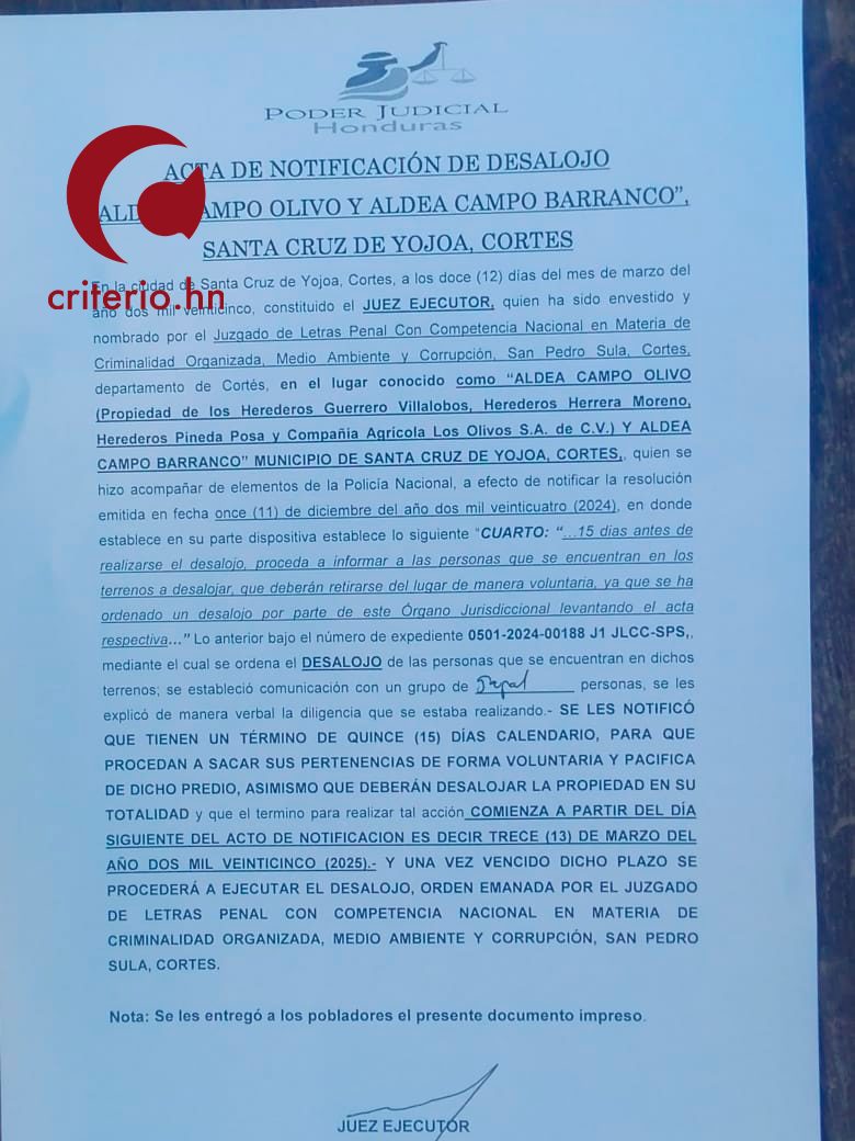 Tegucigalpa.- Hoy, 12 de marzo de 2025, a las 6:00 de la mañana se presentaron 5 patrullas de la Policía Nacional y militares encapuchados en la empresa campesina 17 de junio de la CNTC-El Progreso, ubicada en aldea Campo Olivo, Santa Cruz de Yojoa.