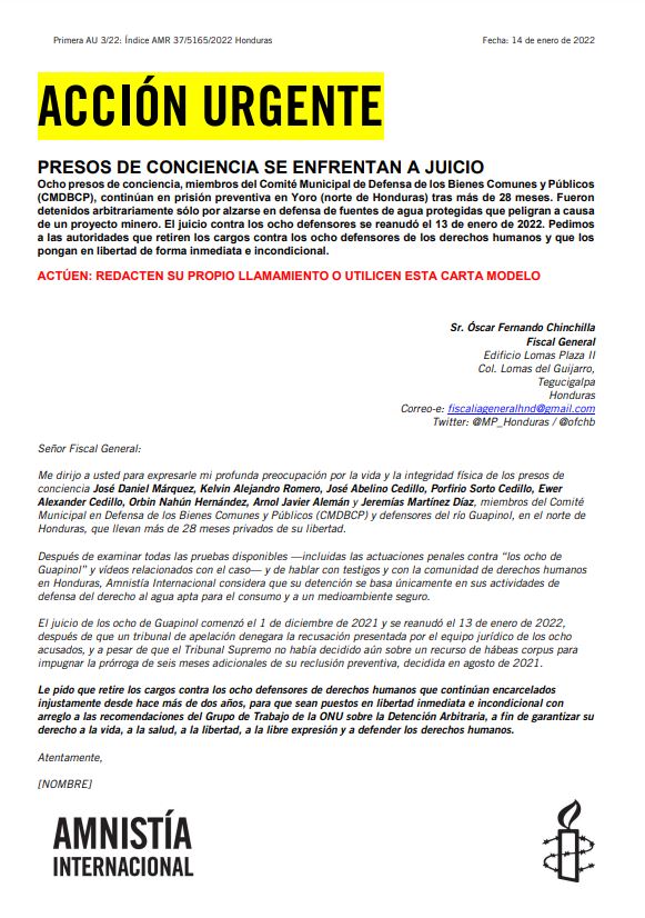 Tegucigalpa.- Amnistía Internacional redactó una carta invitando a una acción urgente de envío de cartas en las que solicitan al fiscal general del Ministerio Público, Óscar Fernando Chinchilla, se retiren los cargos contra los ocho defensores de los ríos Guapinol y San Pedro, actualmente en juicio tras 28 meses de prisión preventiva.