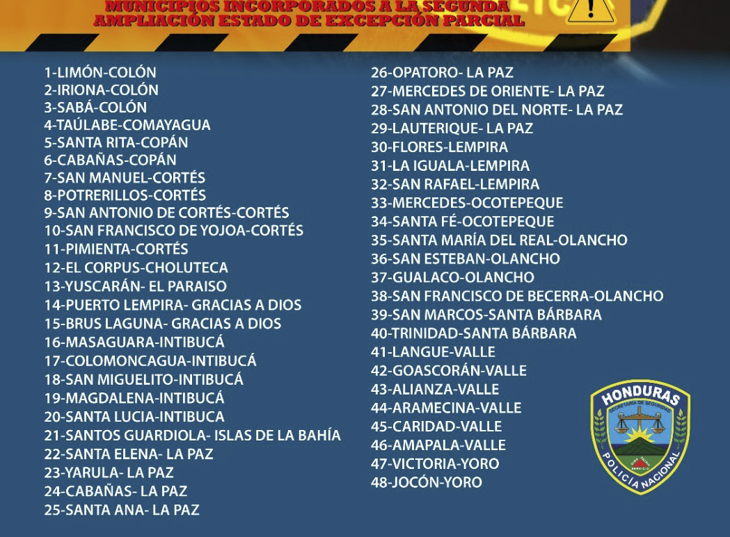 Tegucigalpa.- La totalidad de los barrios y colonias de los municipios de Tegucigalpa y San Pedro Sula, han sido incluidos en el estado de excepción que ahora ha sido ampliado por 45 días más y se aplicará en 123 de los 298 municipios de Honduras.