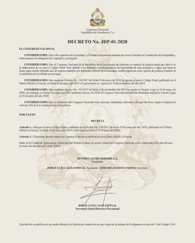 Los congresistas llaman forma alternativa a la publicación del decreto JDP-01-2020, amparado en el contenido del decreto 103-2020, en el periódico de circulación nacional, Diario La Tribuna, esto con el fin de dar trámite a lo acordado en la sesión extraordinaria del mes de junio, donde por mayoría se abrogó el nuevo Código Penal.