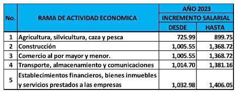 Por lo que el incremento salarial en la rama de la agricultura, silvicultura, caza y pesca, en 2023, será desde 725.99 lempiras hasta 899.75 lempiras; en la construcción y el comercio al por mayor y menor, desde 1,005.55 lempiras hasta 1,368.72; en el transporte, almacenamiento y comunicaciones será desde 1,014.79 lempiras hasta 1,318.16.