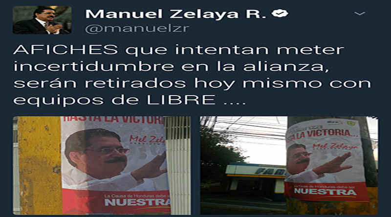 El coordinador de Libre, Manuel Zelaya Rosales, dijo que hasta el mas ingenuo en política se da cuenta de donde viene esa campaña y esos afiches, esto solo demuestra lo preocupados que están los nacionalistas con la alianza de la oposición y agregó que ha pagado gente para que retire esos afiches.
