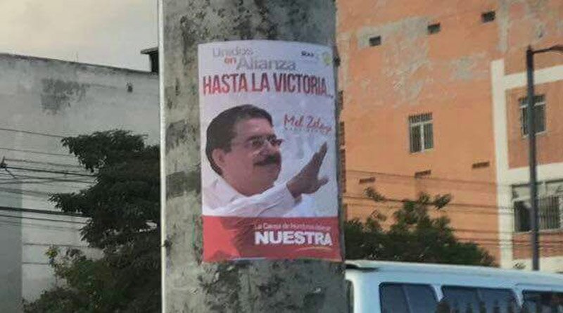 En el afiche se lee: “Unidos en alianza hasta la victoria. Mel Zelaya Presidente”. Y en la parte de abajo del afiche se lee: “La causa de Honduras debe ser NUESTRA”. Con los logos de los partidos Libre y PAC.