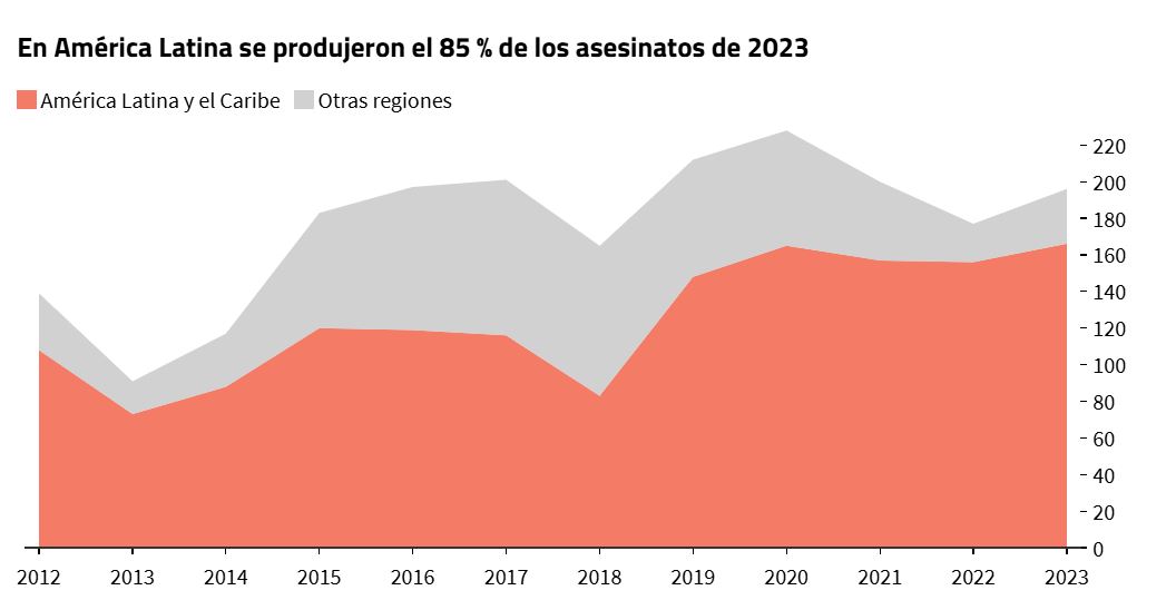 Agregó que la concentración de asesinatos en algunos países también manifiesta tendencias, donde los ataques están ligados a la industria minera, la agroindustria y la industria forestal.