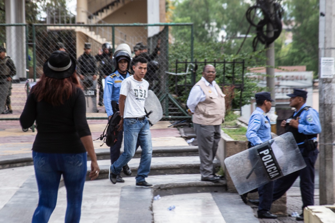 Tegucigalpa.- La cámara del foto periodista Paul Carbajal recorrió las manifestaciones este marte en la capital de Honduras y recoge un reportaje gráfico de lo ocurrido hoy cuando el Congreso Nacional hondureño se vio obligado a retroceder en sus pretensiones de aprobar leyes para despedir médicos y profesores a su antojo, irrespetando los contratos colectivos y los derechos adquiridos por los trabajadores de ambos gremios.