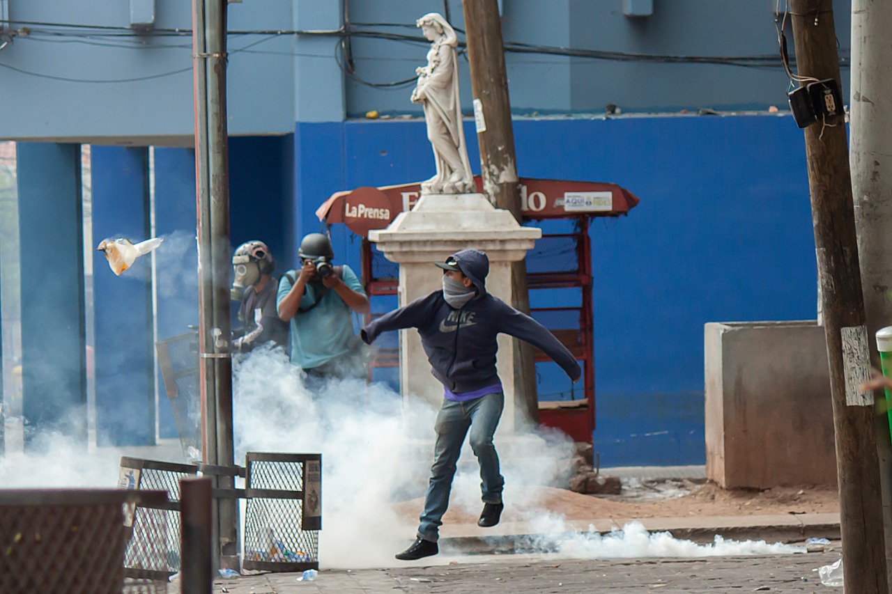 Los fotoperiodistas hacen su trabajo en medio del humo de las bombas lacrimógenas