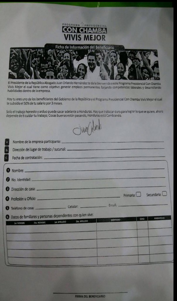 Como el Presidente Juan Hernández NO PUEDE CUMPLIR con su falsa promesa de generar miles de empleos entonces extorsiona a personas que ya tienen empleo para que llenen este formulario y digan que obtuvieron el mismo a través de su programa #ConChambaVivisMejor, amenazando con despedirlos si no lo hacen…