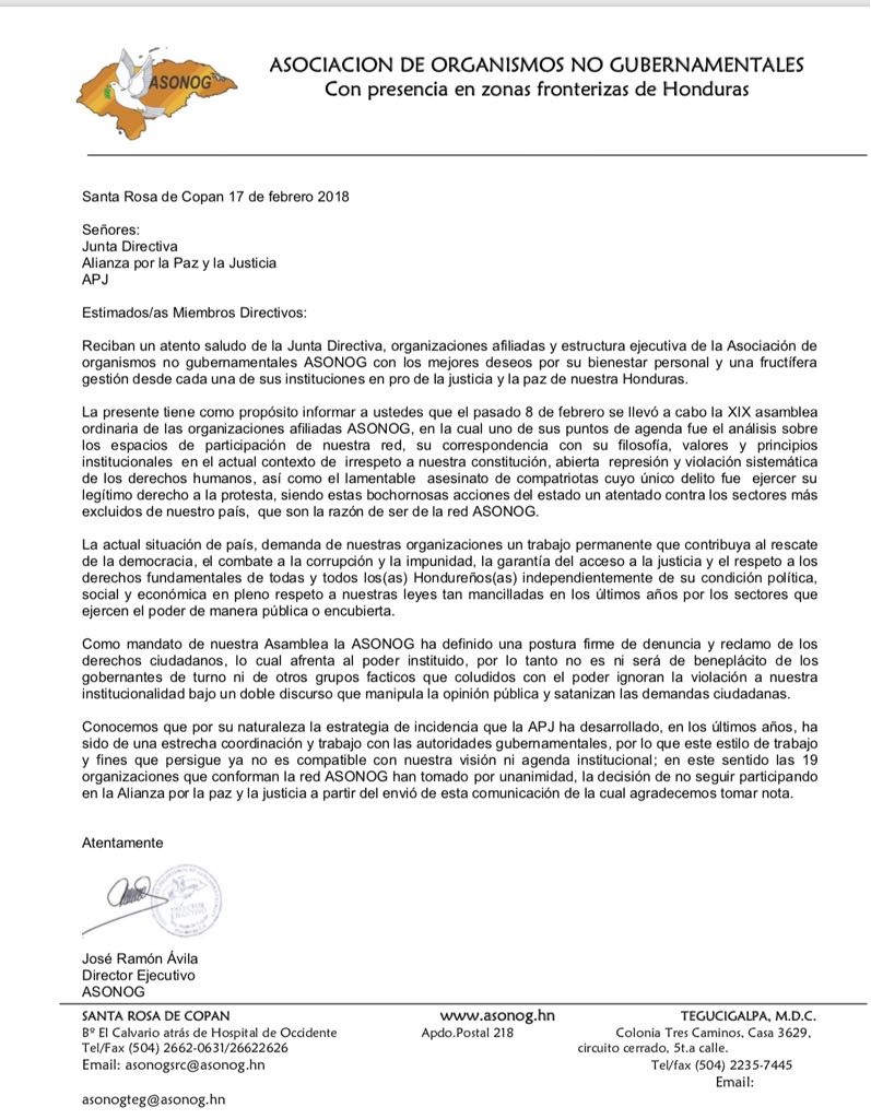 Tegucigalpa.- La Asociación De Organismos No Gubernamentales Con presencia en zonas fronterizas de Honduras (ASONOG), se retira de la Alianza por la Paz y la Justicia (APJ).