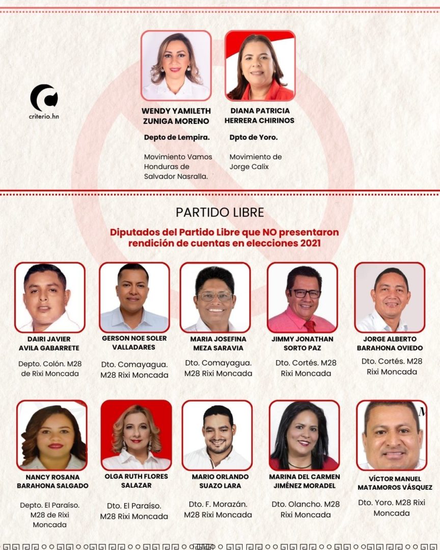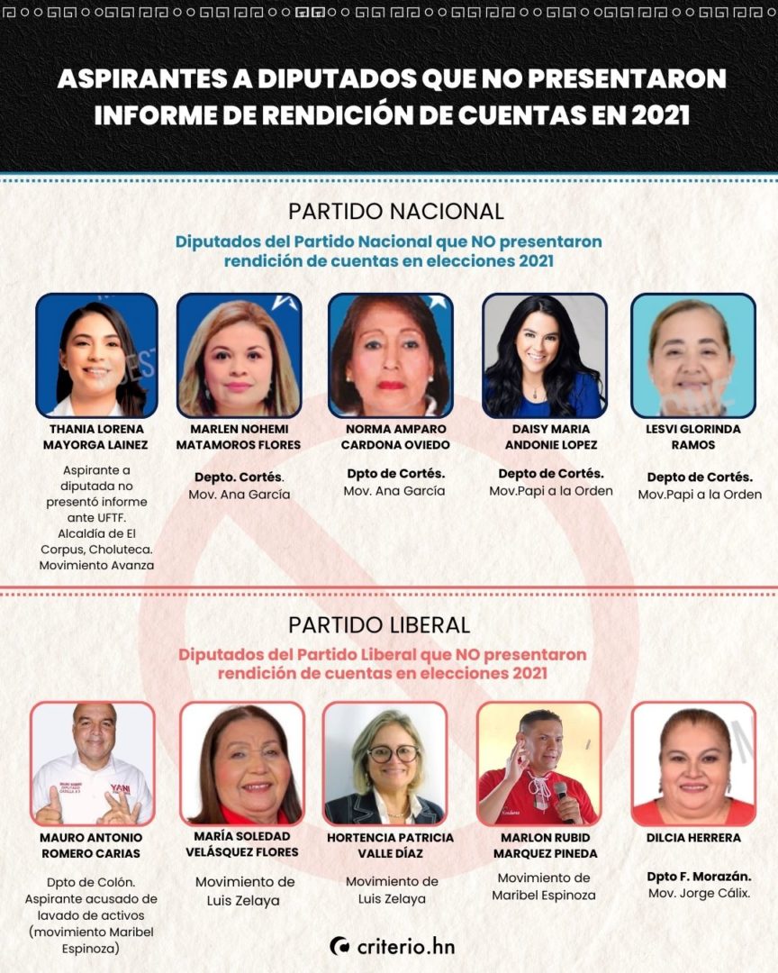 De acuerdo a una solicitud de información realizada por Criterio.hn a la Unidad de Financiamiento, Transparencia y Fiscalización a Partidos Políticos y Candidatos (UFTF), 478 candidatos a diputados fueron sancionados por no rendir cuentas tras su participación, sin embargo, esto no ha detenido a 22 de ellos vuelvan a postularse con la intención de obtener un escaño en el Congreso Nacional.