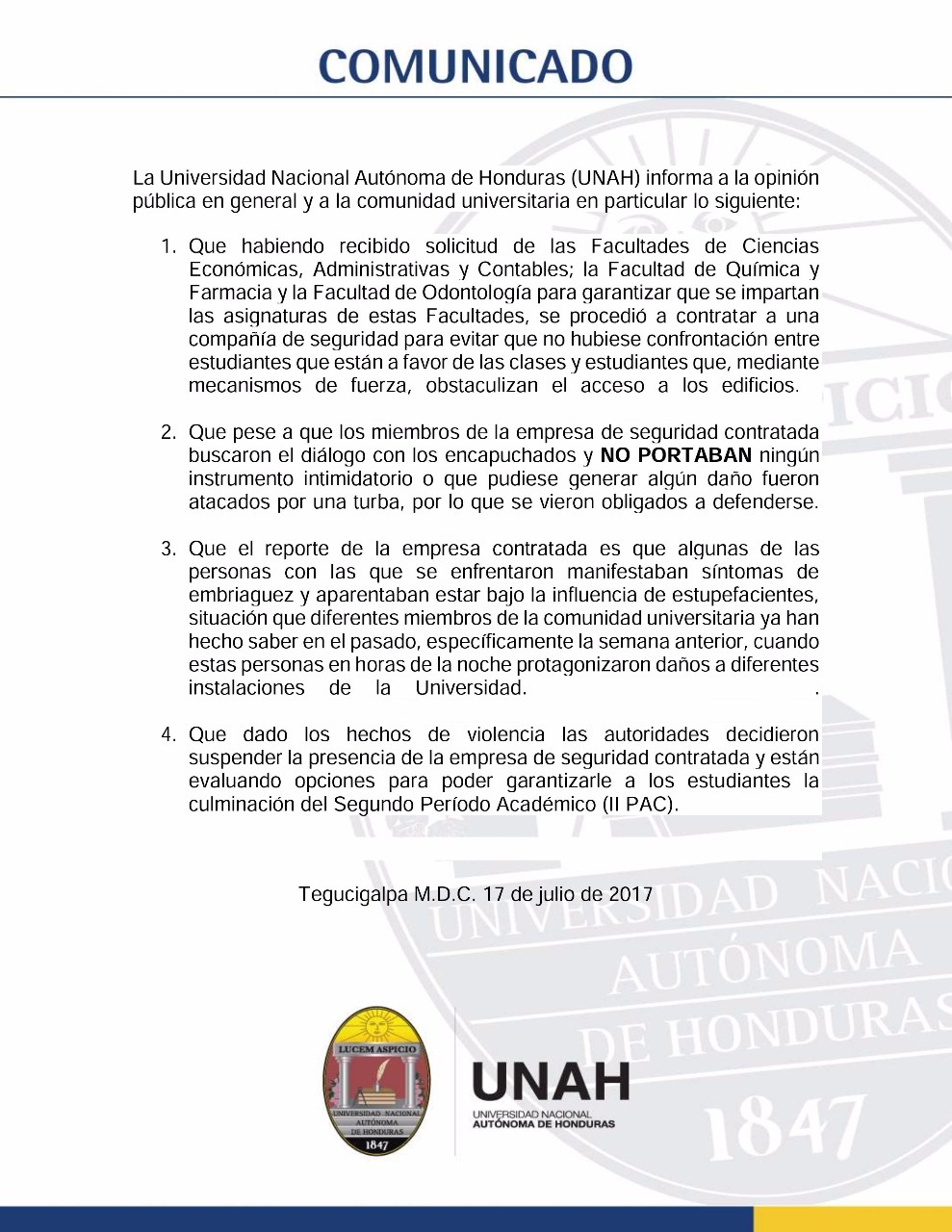 Tegucigalpa.- Las autoridades de la Universidad Nacional Autónoma de Honduras en un comunicado emitido la tarde de este lunes ha salido en defensa de la empresa Spartan Security diciendo que no portaban ningún tipo de arma y que se vieron atacados por una turba y lo que hicieron fue defenderse.