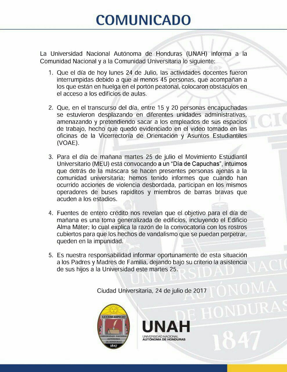Las autoridades de la UNAH emitieron esta noche un nuevo comunicado mediante el cual se desligan de responsabilidad por lo que pueda ocurrir este martes en ciudad universitaria y sugieren a los padres de familia que queda a su criterio enviar o no a clases a los estudiantes.