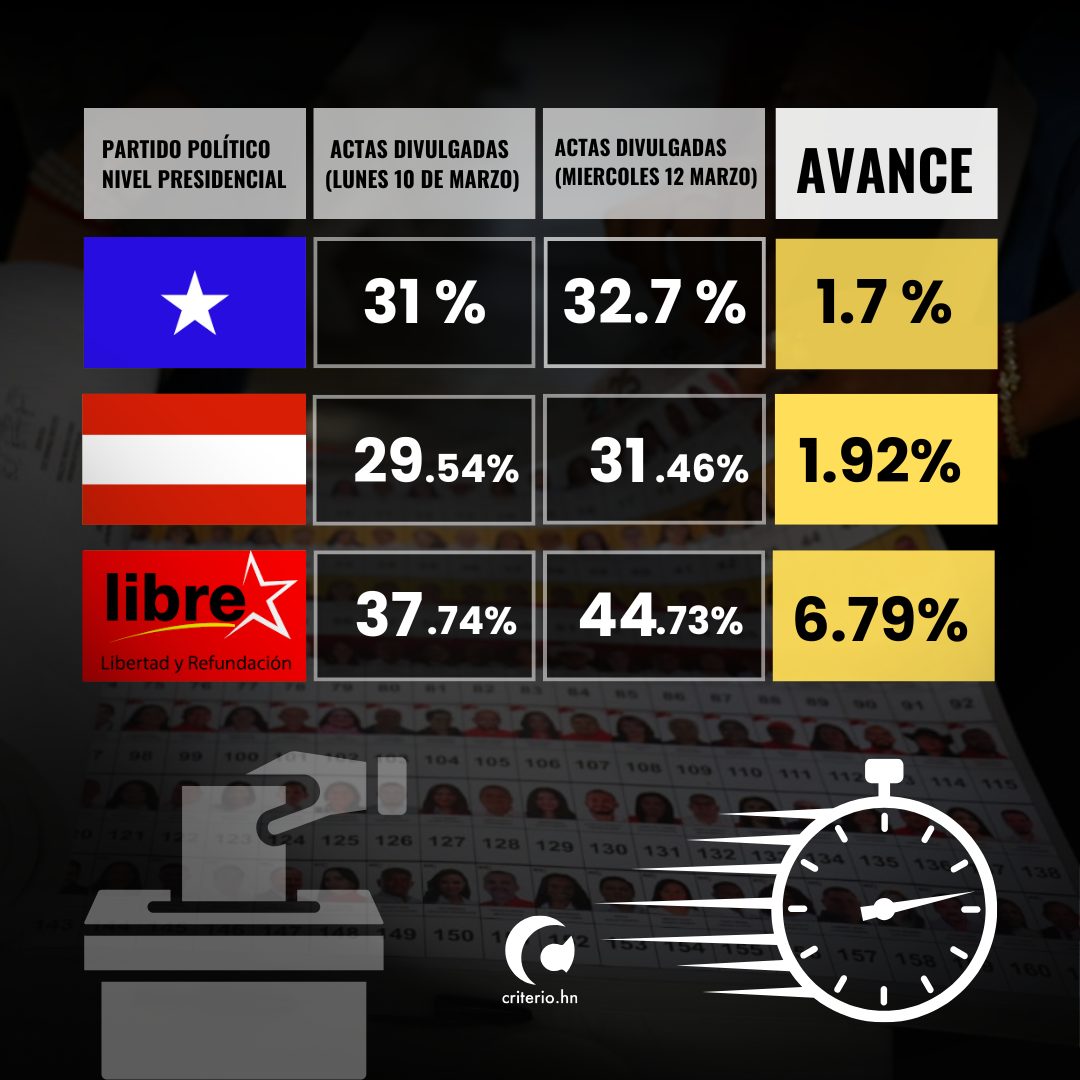 Los avances, a nivel presidencial, desde entonces han sido menores al dos por ciento para los Partidos Nacional y Liberal, mientras que las actas publicadas en Libre han sido del 6.99%. Mientras que el número de actas divulgadas a nivel de diputados y alcaldías es inferior.