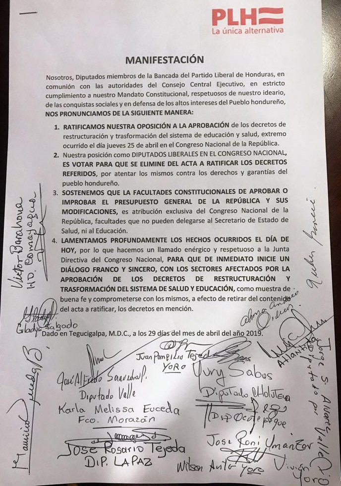 Manifestaron además que su posición como diputados liberales en el congreso nacional, es votar para que se elimine del acta a ratificar los decretos referidos, por atentar los mismos contra los derechos y garantías del pueblo hondureño.