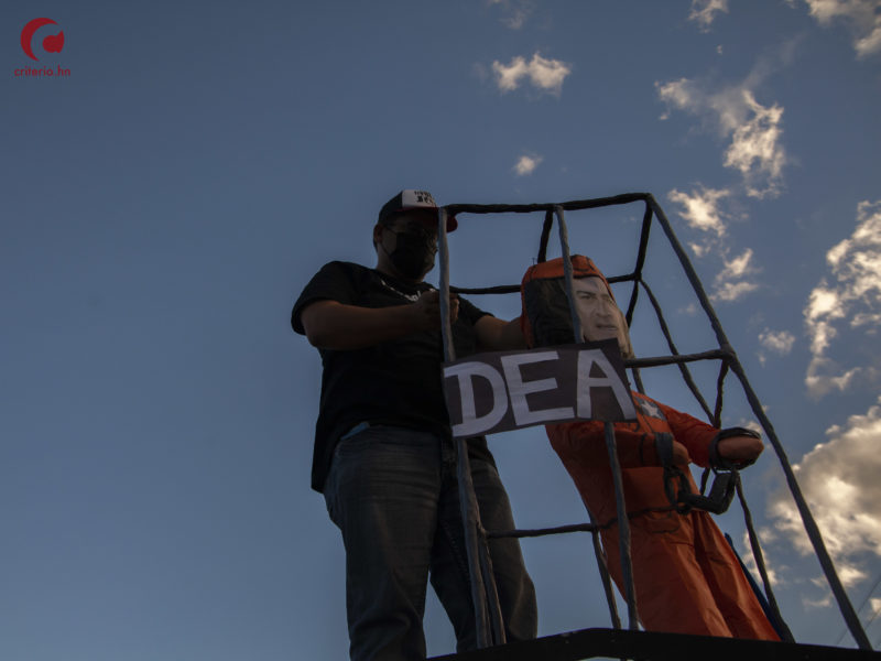 Manifestantes con un monigote del presidente Hernández en una protesta en Tegucigalpa el pasado 26 de febrero (Foto Criterio.hn)