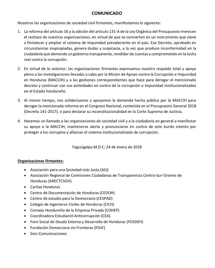 Respaldan el trabajo de la MACCIH y piden a las demás organizaciones que den su respaldo a la misión y que se mantengan atentos antes este burdo intento por proteger los corruptos y afianzar el sistema institucionalizado de corrupción.
