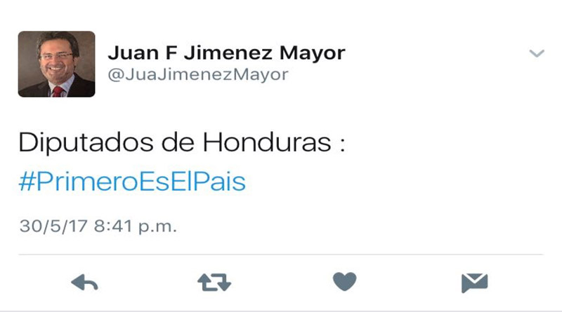En otro tuit al salir de la sesión del Poder Legislativo, Jiménez escribió: Diputados de Honduras #PrimeroEsEl País.