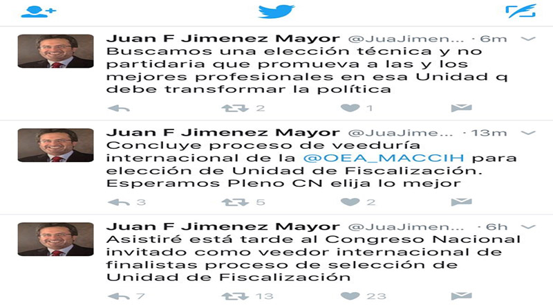 El vocero de la MACCIH, Juan Jiménez Mayor, escribió varios tuits donde manifestaba que se buscaba una evaluación técnica y no partidaria que promueva a las y los mejores profesionales en esa unidad que debe transformar la política.