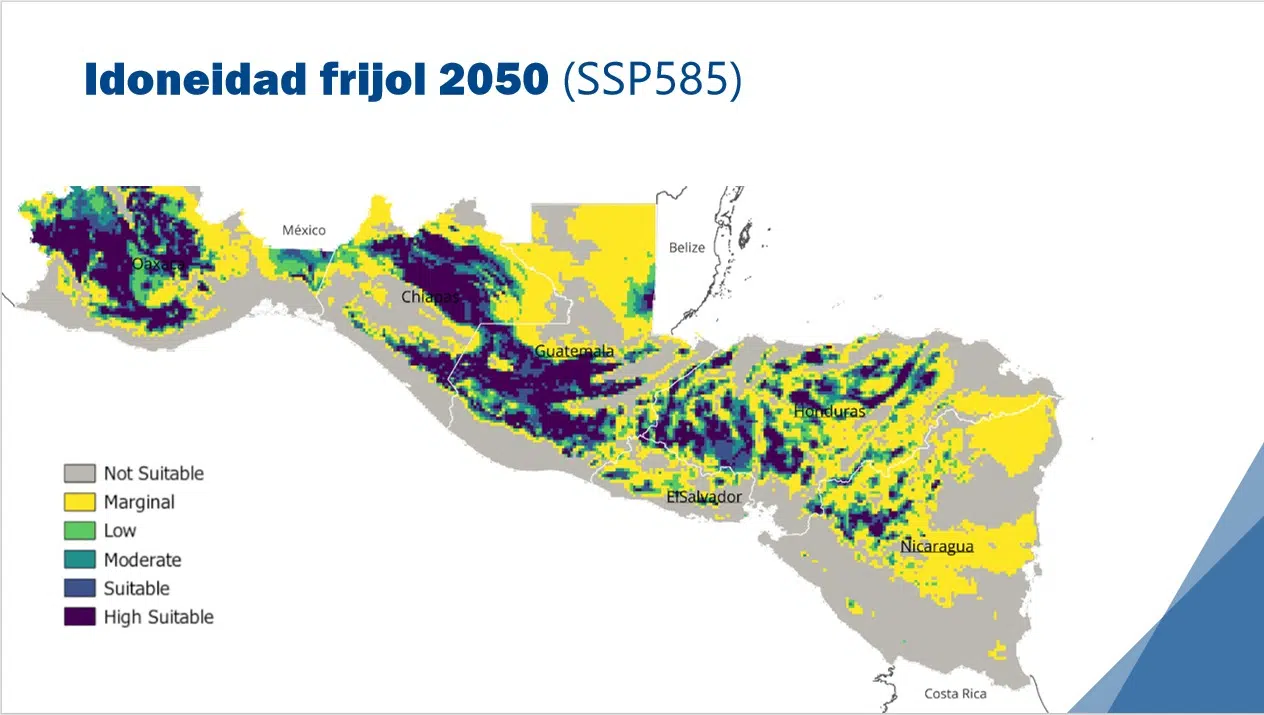 La productividad de estos cultivos se verá reducida en varias zonas del país hacia 2050. “En los peores escenarios, un productor que hoy cosecha 20 quintales de frijol podría llegar a producir apenas 10, lo que comprometería la alimentación de su familia y el abastecimiento del mercado nacional”, detalló el investigador.