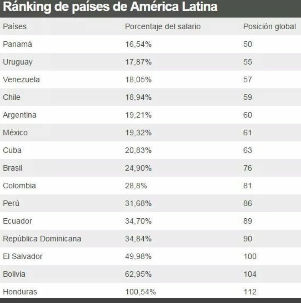 Uruguay, Venezuela, Chile, Argentina, México y Cuba le siguen en ese orden: requieren entre el 10 y el 20% del salario medio.