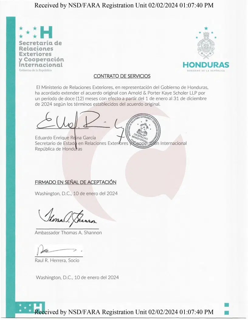 El 10 de enero de 2024, se realizó una nueva ampliación por un período adicional de doce meses, vigente desde el 1 de enero hasta el 31 de diciembre de 2024, manteniendo los mismos términos y condiciones del contrato original. La extensión fue firmada por el canciller hondureño, Eduardo Enrique Reina, y el gerente de Arnold & Porter, Thomas A. Shannon.