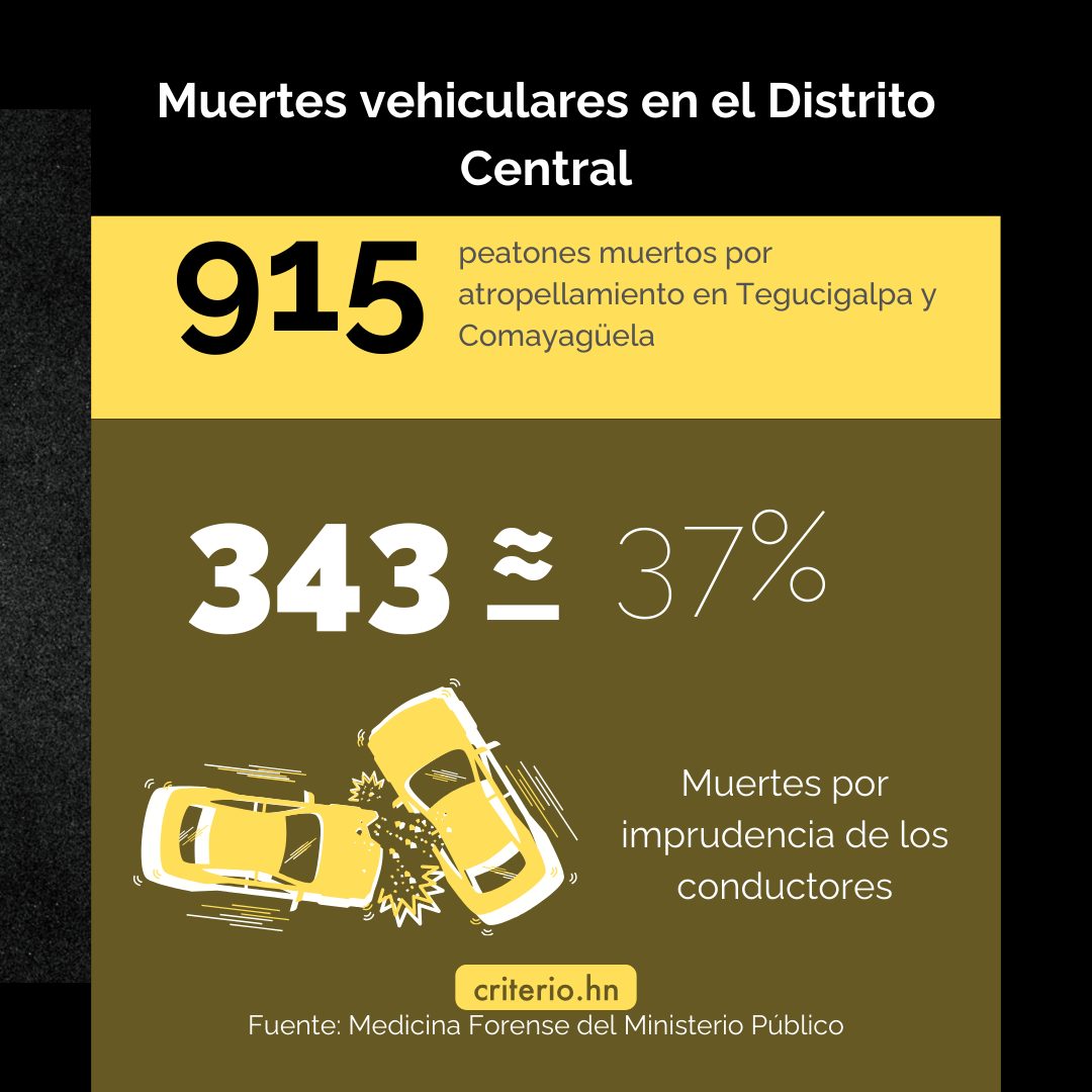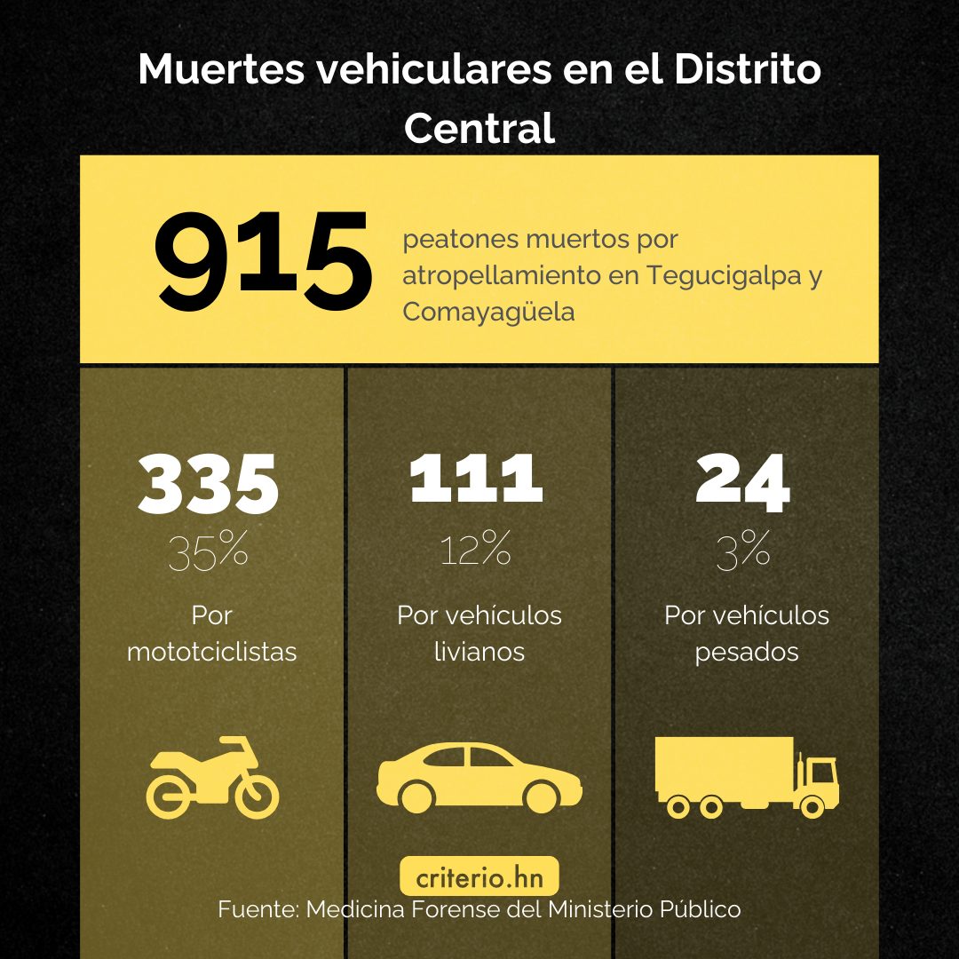 De las 915 personas que han muerto atropelladas en las ciudades gemelas que integran el Distrito Central, los motociclistas son responsables de 335 de estas muertes, lo que equivale al 37% del total, de acuerdo con los datos compartidos por el Ministerio Público.