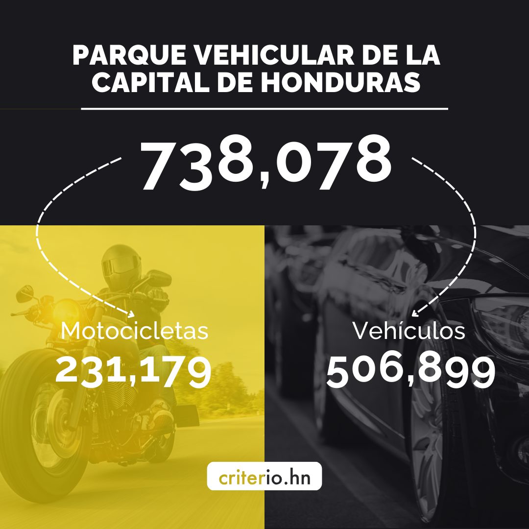 Información proporcionada, a Criterio.hn en 2023, por el Instituto de la Propiedad (IP), estableció que el parque vehicular del Distrito Central estaba compuesto por 738,078 vehículos. De estos, 506, 899 eran automóviles y 231, 179 motocicletas.
