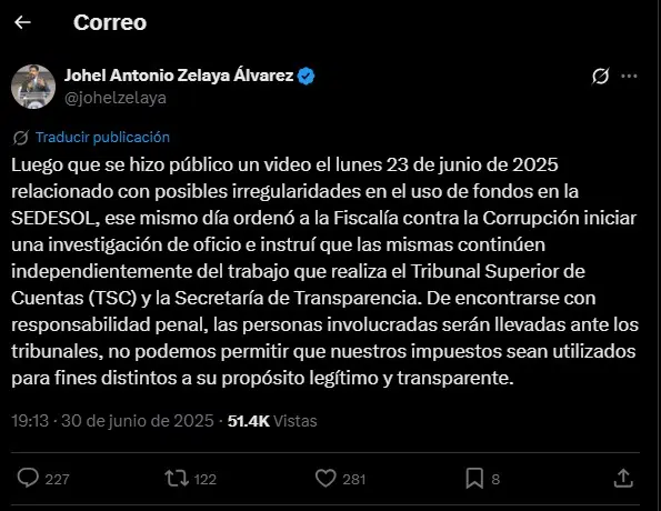Tras la aclaración, el dos de julio, Zelaya ordenó a fiscales del Ministerio Público y agentes de la ATIC la intervención de las oficinas de SEDESOL ubicadas en el Centro Cívico Gubernamental e instruyó a otro equipo a movilizarse al departamento de Copán con el objetivo de entrevistar a los beneficiados con los fondos entregados por la diputada del Partido Libre, Isis Cuéllar.