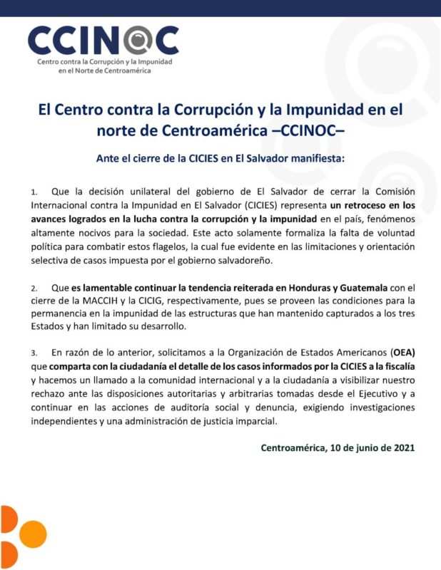 Tegucigalpa.- El Centro contra la Corrupción y la Impunidad en el norte de Centroamérica (CCINOC) en un comunicado público emitido este día lamentó el cierre de la Comisión Internacional contra la Impunidad en El Salvador (CICIES)